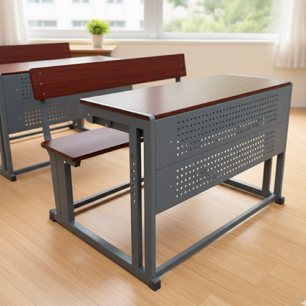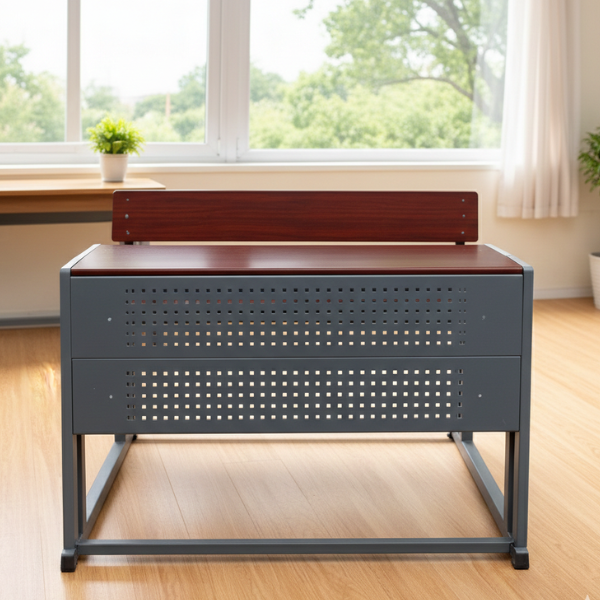 This premium classroom workstation is engineered for durability, functionality, and student comfort. Featuring a high-strength, powder-coated steel frame and a refined mahogany-finish wooden top, this integrated unit is designed to withstand the rigors of daily school use. The streamlined, space-saving design ensures a tidy classroom layout, while the perforated metal front panel adds a modern aesthetic and privacy for students. It is the ideal choice for educational institutions looking for a blend of contemporary style and long-lasting performance.