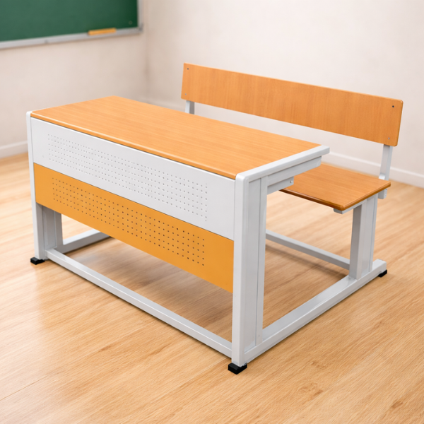 This dual student school desk and bench set is designed for classrooms, schools, and educational institutes where durability and student comfort are essential. The desk features a yellow laminated desktop and bench seat supported by a strong grey powder-coated metal frame for long-lasting performance.