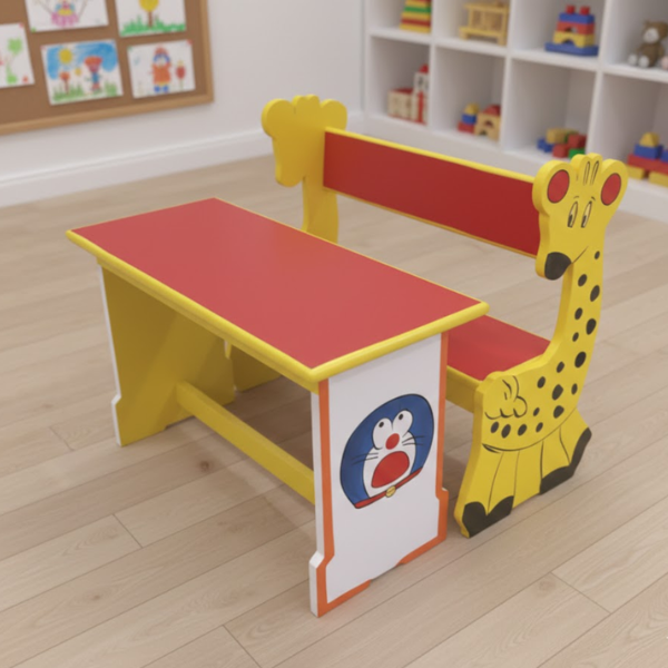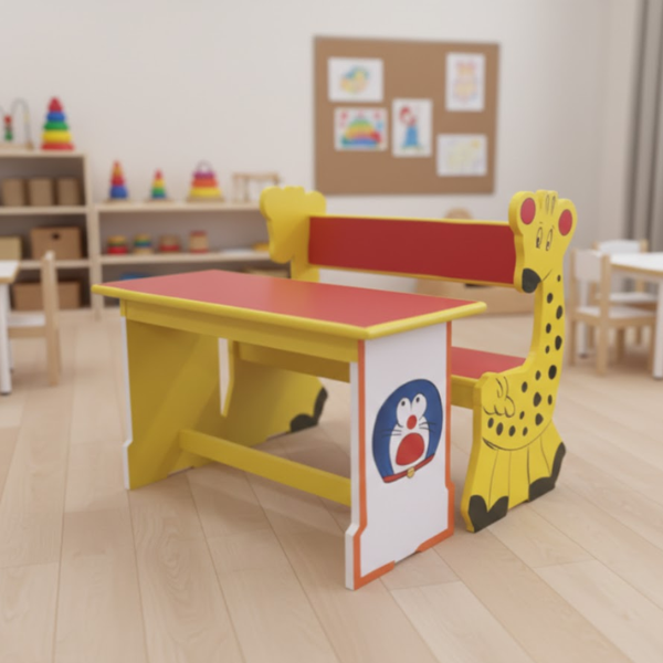 Brighten up any learning space with our vibrant Animal-Themed Dual Desk. Specifically designed for early learners, this desk combines a playful giraffe-shaped backrest with iconic cartoon graphics to create an engaging environment for children. The sturdy construction features high-quality laminated surfaces and a robust frame, ensuring it withstands the daily activities of a busy classroom. Its ergonomic seating supports two children comfortably, making it a perfect addition to modern play schools and nurseries.