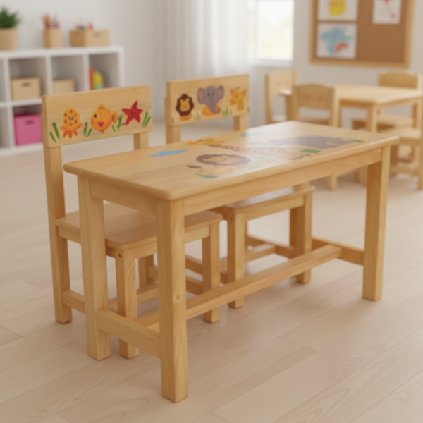 Inspire a love for nature with our Wildlife Adventure Dual Desk. This premium wooden-finish desk features beautifully printed illustrations of lions, giraffes, and elephants on the desktop and backrest. Designed specifically for young children, it combines a warm, natural aesthetic with high-quality craftsmanship. The integrated two-seater design encourages collaborative learning while providing a sturdy and safe environment for classroom activities, storytelling, and creative play.
